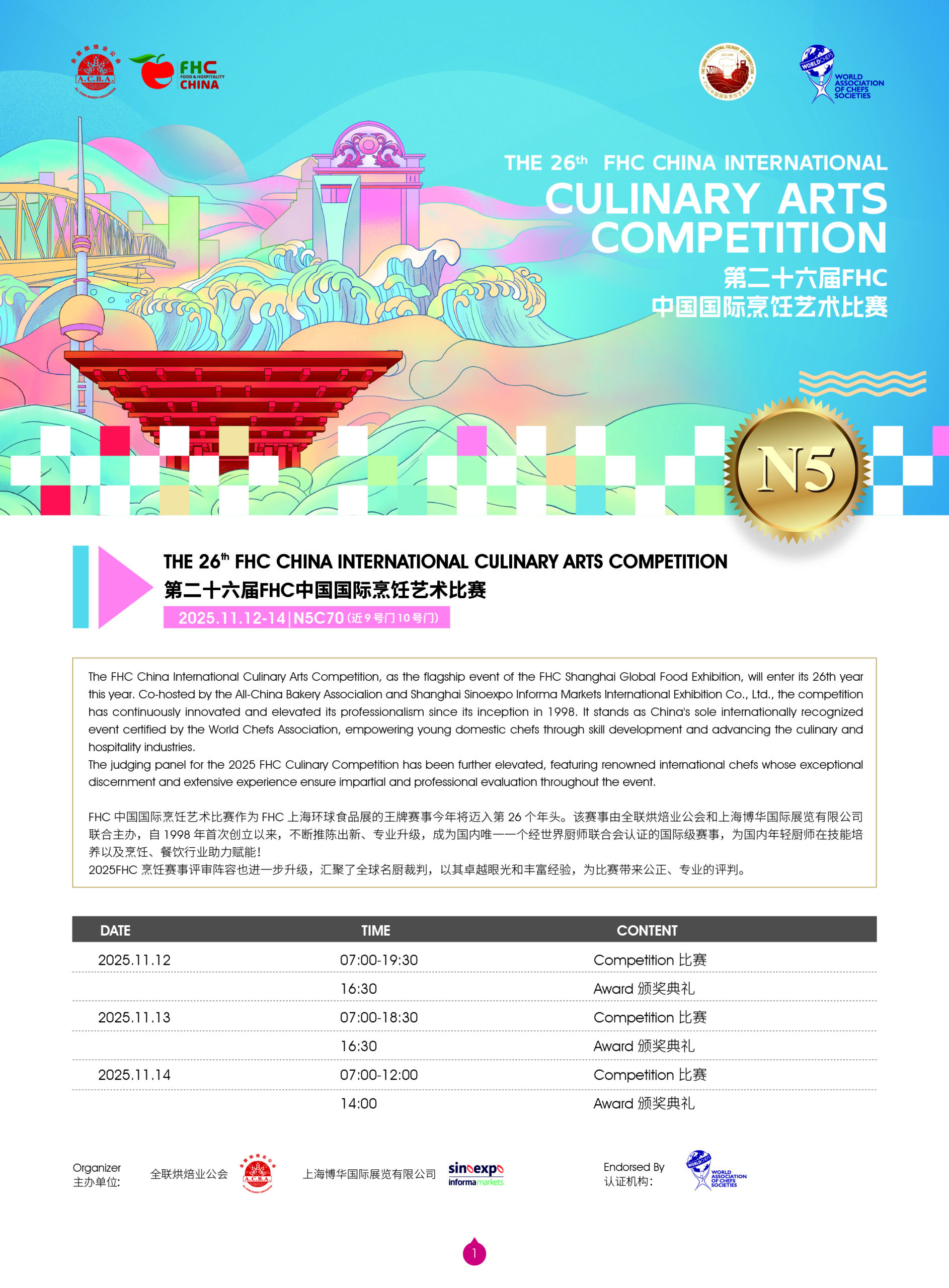 第二十六届FHC中国国际烹饪艺术比赛由全联烘焙业公会、上海博华国际展览有限公司主办,获得世界厨师联合会(World Association of Chefs’ Societies)A级国际赛事官方认证。FHC中国国际烹饪艺术比赛自1998年举办首届以来,一直秉承不忘初心,给予爱好烹饪并为之付出热情的学生或厨师们一个切磋技艺、互相交流的竞技平台,提升并培养年轻厨师,更以此促进和加强西餐在中国的发展,将中西餐文化交汇相融,协作共赢。在赛事组委会老师们的通力指导以及选手和社会各界的高度认可和关注下,已经从洲际性赛事一跃成为A级国际赛事,将赛事提升为更高水准和级别的专业烹饪赛事,这也意味着该项赛事已然成为含金量极高的国际性烹饪比赛。